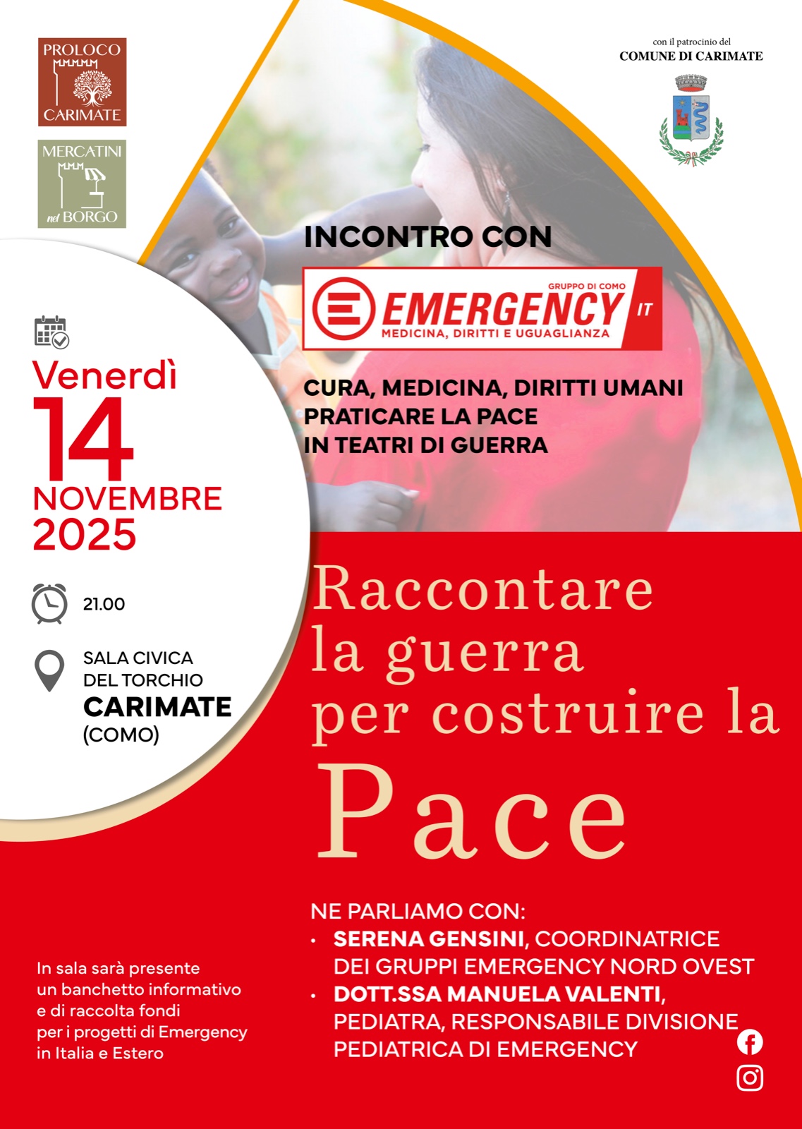 Incontro pubblico per parlare di cura, medicina, diritti umani, come praticare la pace in teatri di guerra, con Serena Sensini coordinatrice dei gruppi Emergency Nord-Ovest, dott.ssa Manuela Valenti, pediatra, responsabile divisione pediatrica di Emergency.