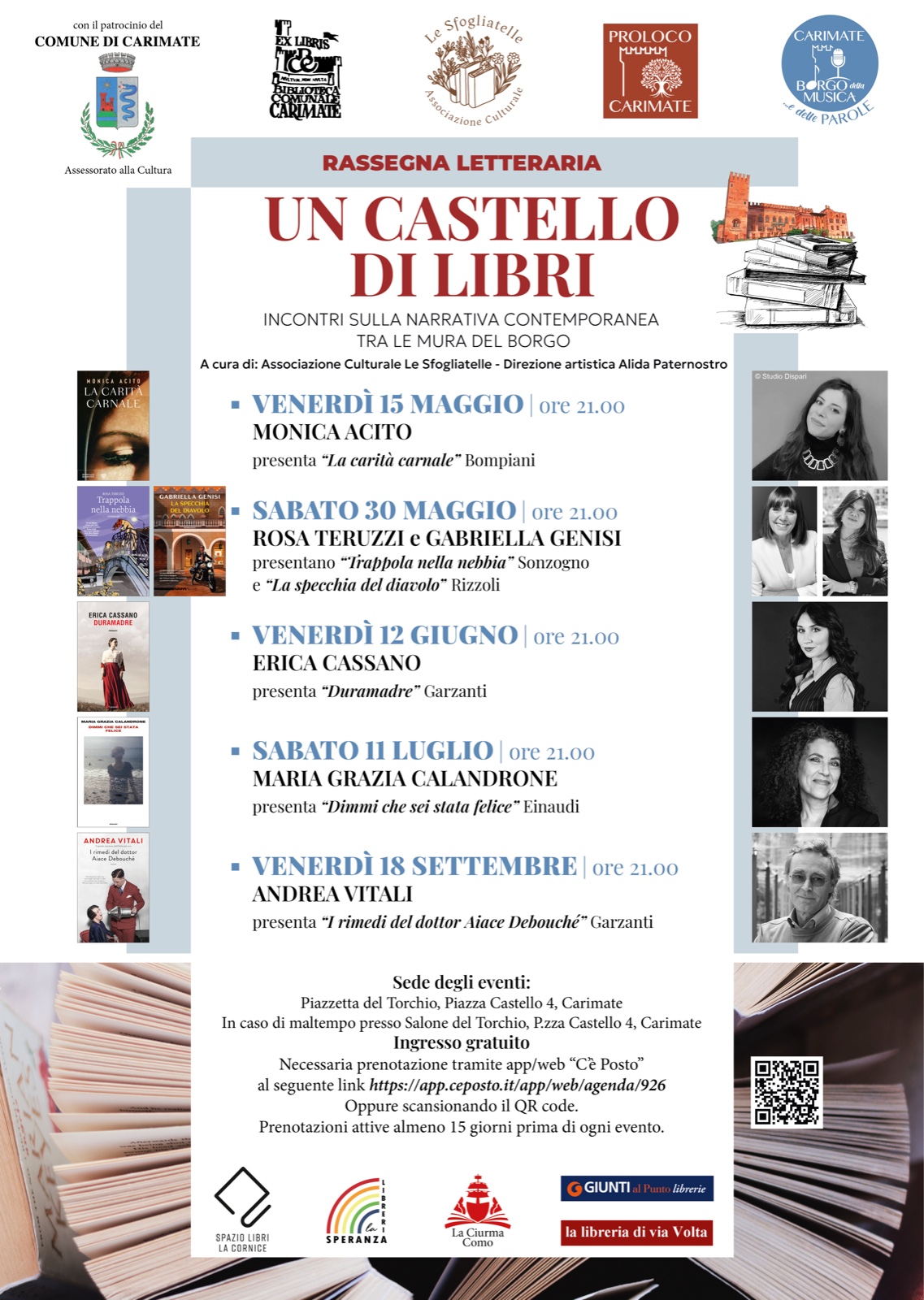 L’Assessorato alla Cultura è lieto di presentare la prima edizione di “Un castello di libri. Incontri sulla narrativa contemporanea tra le mura del borgo,” rassegna letteraria a cura dell’Associazione Culturale Le Sfogliatelle in collaborazione con Pro Loco Carimate e biblioteca comunale.