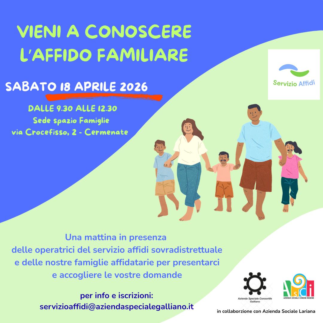 Si informa la cittadinanza cheil servizio affidi dell'Azienda Speciale Consortile Galliano in collaborazione con Azienda Sociale Lariana organizza sabato 18.04.2026 dalle 9.30 alle 12.30 presso la Sede Spazio Famiglie di Via Crocefisso, n. 2 a Cermenate la giornata "Vieni a conoscere l'affido familiare": una mattinata in presenza delle operatrici del servizio affidi sovradistrettuale e delle famiglie affidatarie per presentarsi ed accogliere le domande dei partecipanti.
